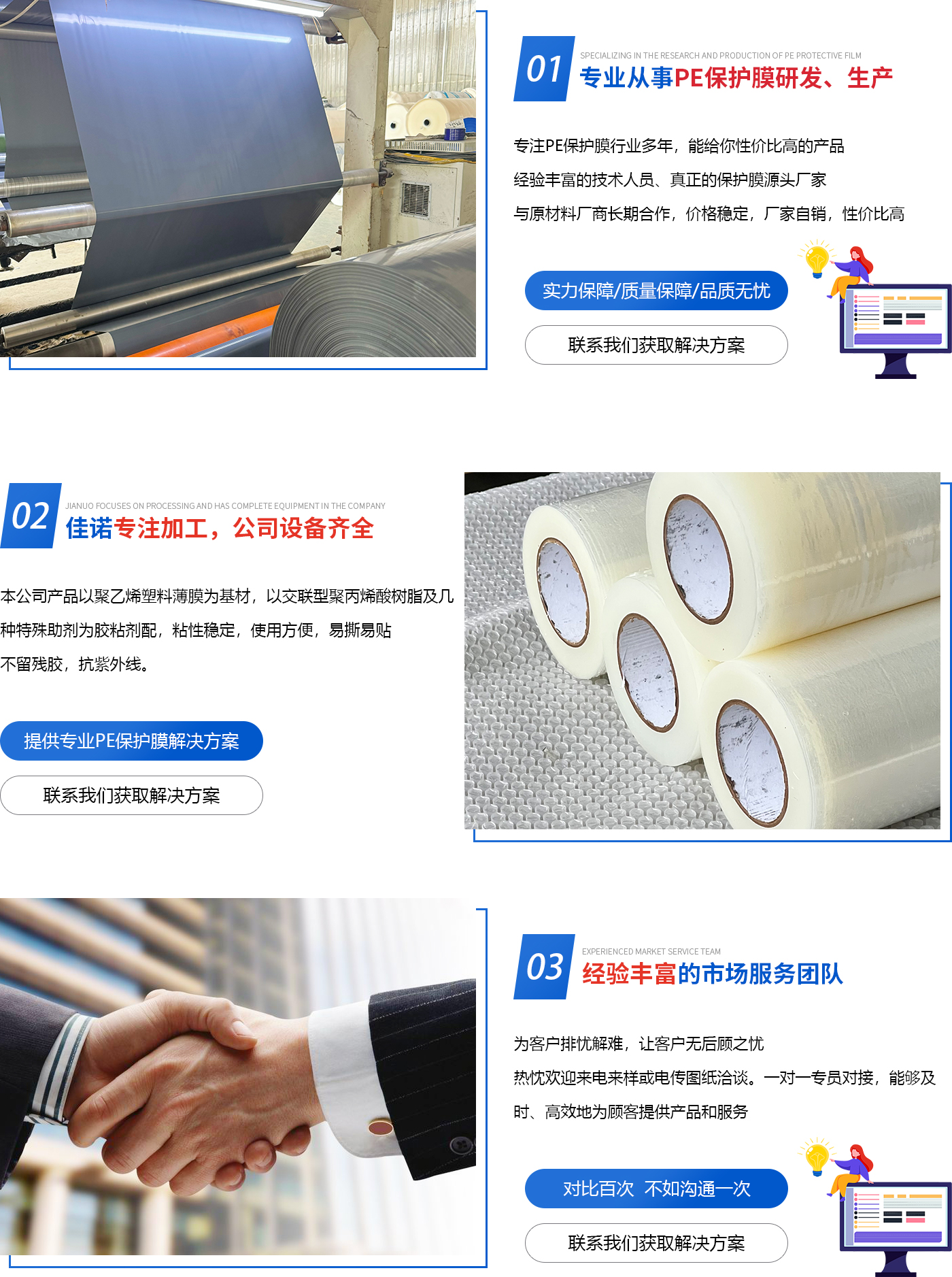 德州佳諾塑業(yè)有限公司生產(chǎn)防靜電自粘膜,包裝膜,筒子膜,原模,各種PE保護(hù)膜以及保護(hù)膜基材。公司生產(chǎn)保護(hù)膜、膠帶,是各類不銹鋼板、彩鋼板、鋁塑板、防火板、塑鋼型材、裝飾板、有機(jī)玻璃制品、漆面板、鏡面板、外墻板,保溫板,石英石,大理石,人造石,瓷磚,防盜門,木門,不銹鋼門窗,各種裝飾面板,各種建筑板材、地毯,以及電子、家用電器、家具、汽車制造,等行業(yè)不可缺少的表面保護(hù)材料。使被貼物在運(yùn)輸、加工、貯存和使用過程中不受污染、腐蝕、劃傷,保護(hù)原有的光潔亮澤的表面,從而提高產(chǎn)品質(zhì)量。 本公司產(chǎn)品用于鋁型材,PVC等材質(zhì)型材保護(hù)膜,鋁門等鋁制品保護(hù)膜,鋁塑板,不繡鋼,鋁合金等產(chǎn)品表面保護(hù)膜,保護(hù)其在運(yùn)輸途中,生產(chǎn),安裝時(shí)對(duì)產(chǎn)品表面所造成的刮傷,灰塵等。可用于,汽車門,木地板,冰箱表面等家電及電子產(chǎn)品表面的保護(hù)。 基材:PE材質(zhì) 粘性:低粘,中粘,高粘,特高粘 膜材:透明膜,藍(lán)膜,黑白膜,乳白膜 ( 除藍(lán)膜外,其...